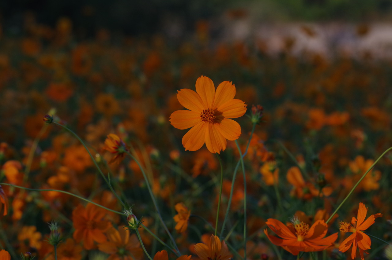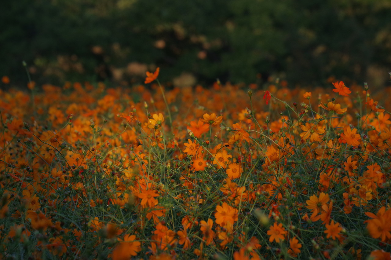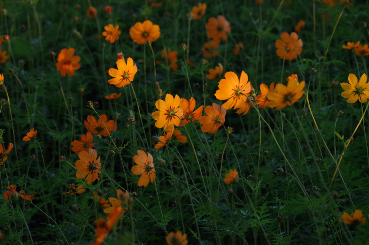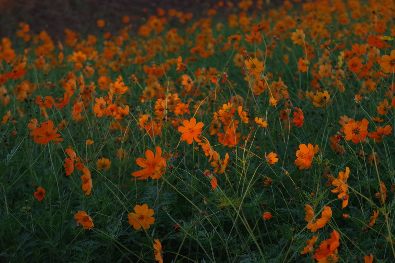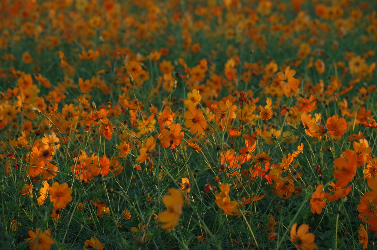 一面のコスモスに朝日が当たり始め、この瞬間が良いのですね、確かに他の画像とは違った美しさがあります、この瞬間を撮るために早起き、遠征、好きでないと出来ませんね、何時も良い写真ありがとうございます、解説付きでとても参考になります、しかし、5キロ、2万歩とは!。