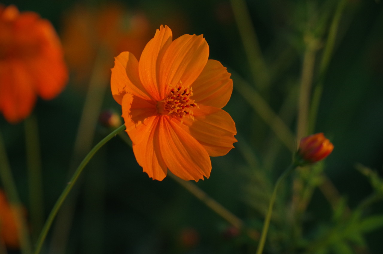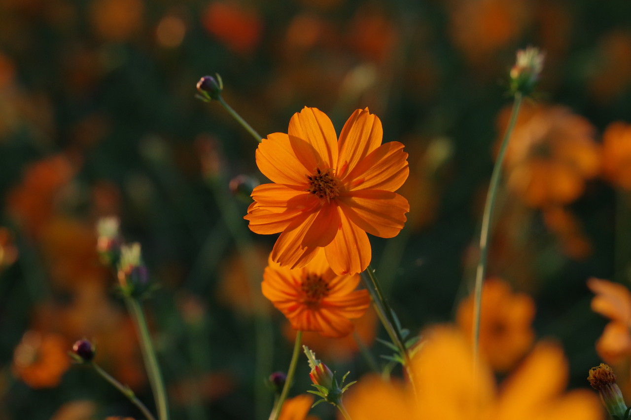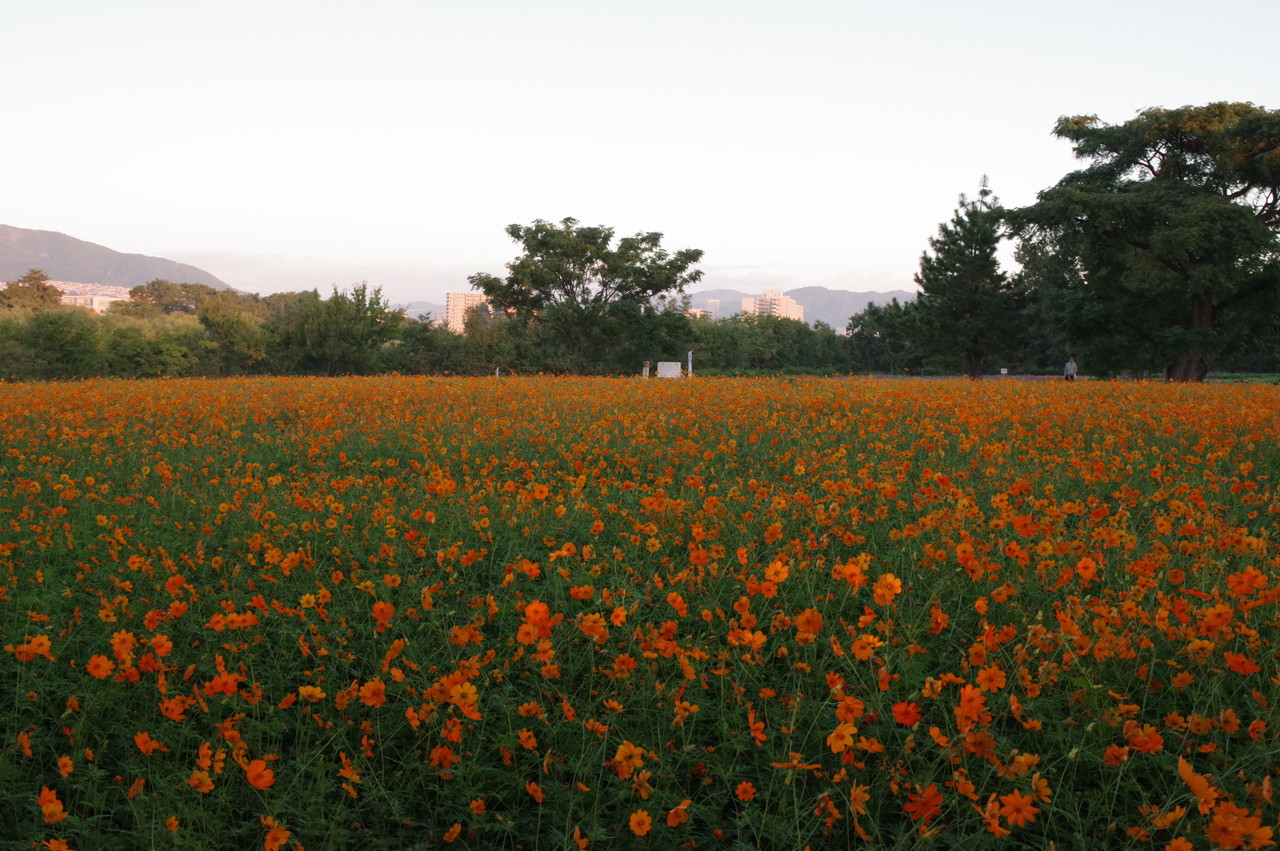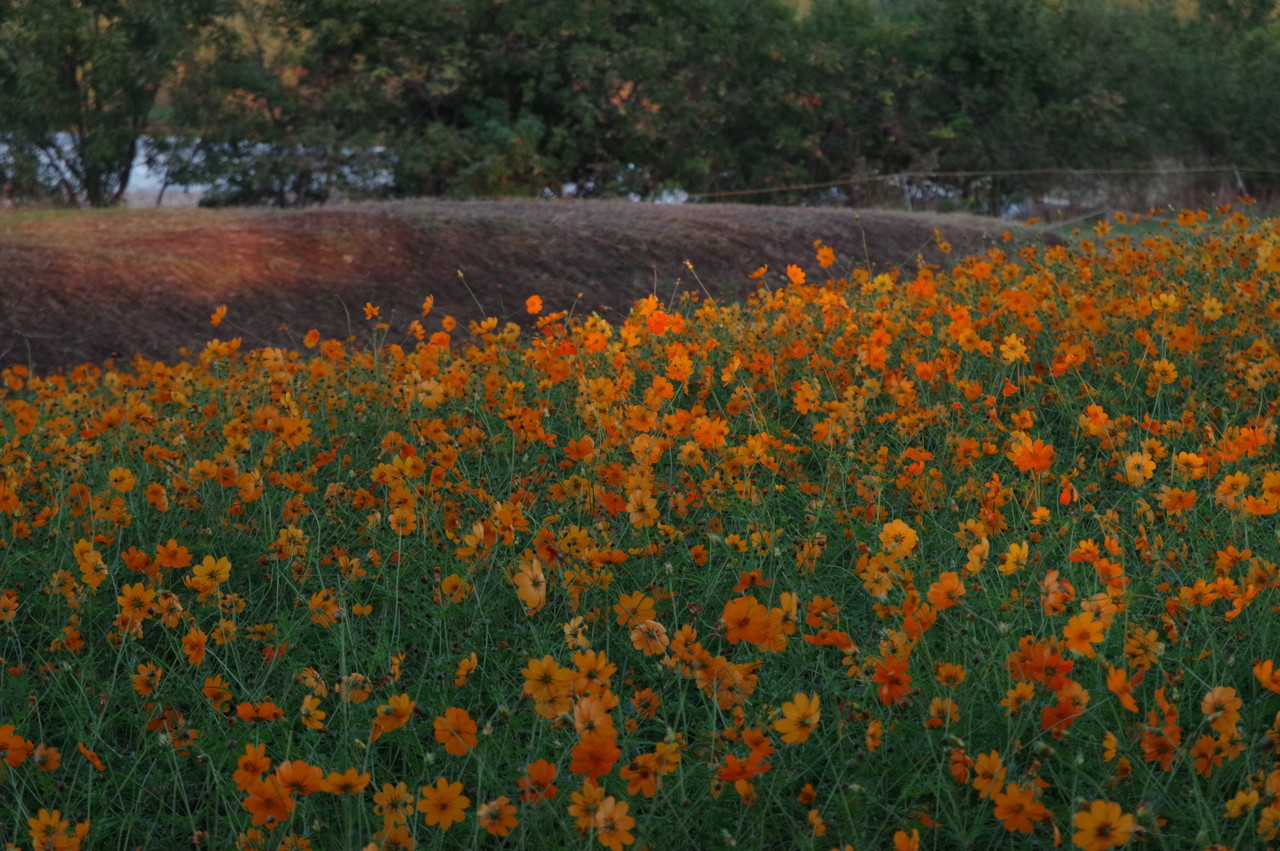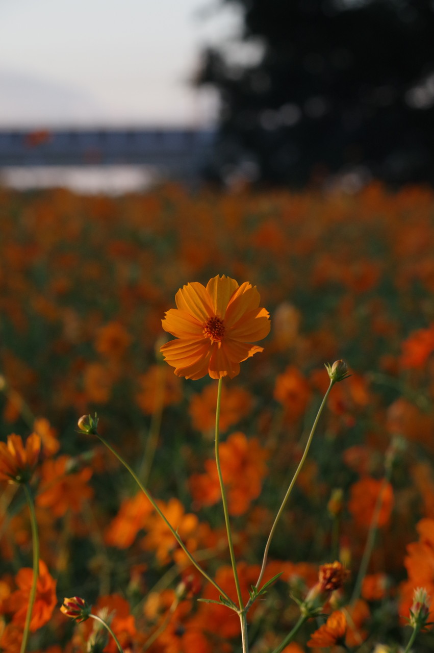 一面のコスモスに朝日が当たり始め、この瞬間が良いのですね、確かに他の画像とは違った美しさがあります、この瞬間を撮るために早起き、遠征、好きでないと出来ませんね、何時も良い写真ありがとうございます、解説付きでとても参考になります、しかし、5キロ、2万歩とは!。
