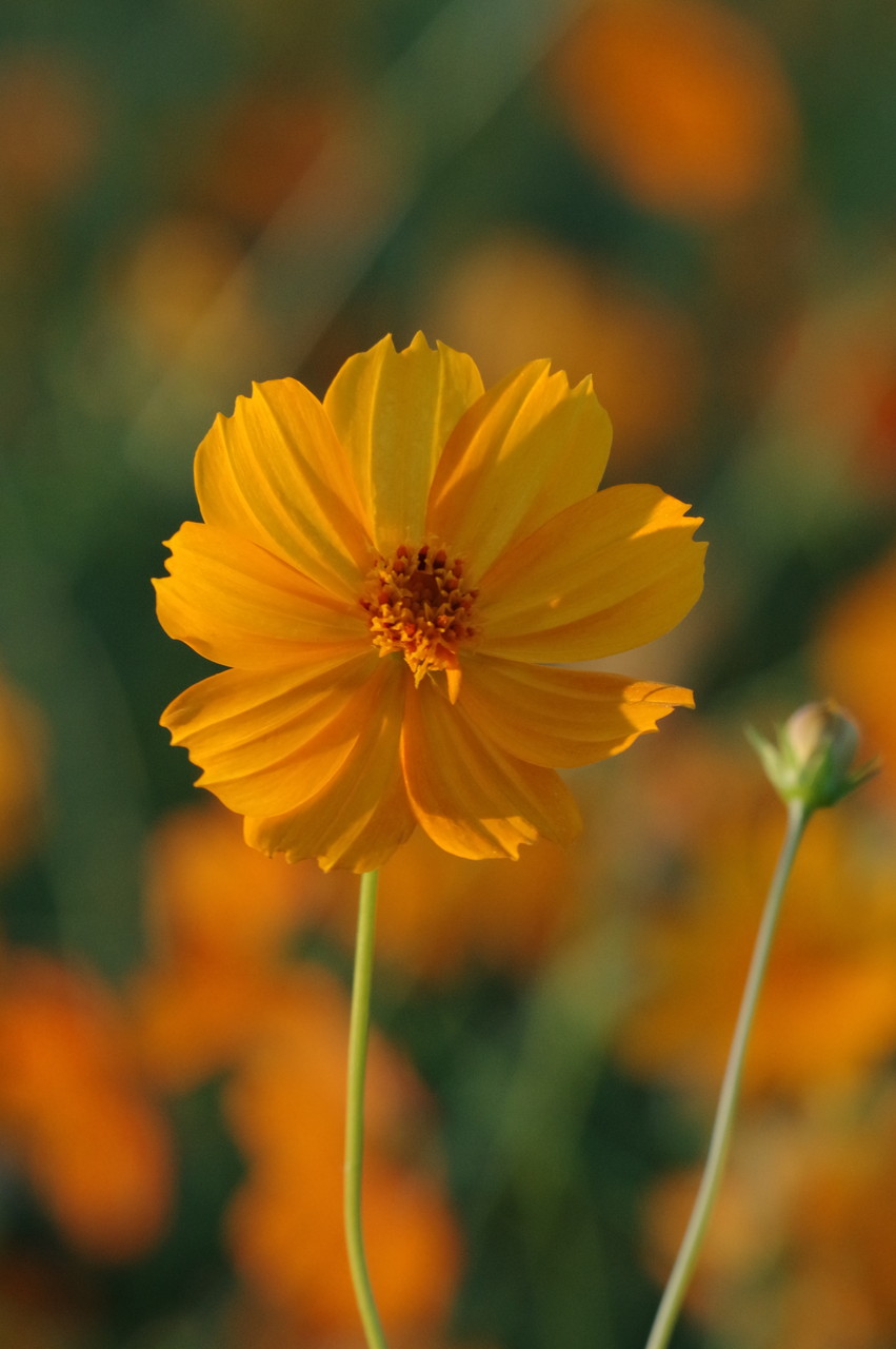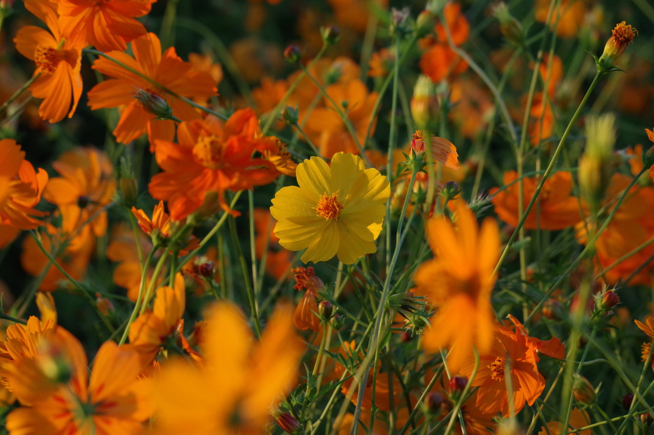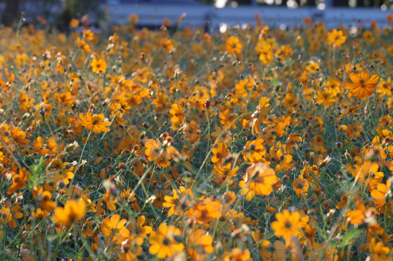 まずは今回はキバナコスモスを貼りつけますね。遠目に見ると黄色のジュータン。花一つ一つも元気いっぱいのビタミンカラー。撮ってもらいたいと主張する?お花、撮りたいと思うお花を探しながらキバナコスモスの周りをグルグルと歩き回ります。