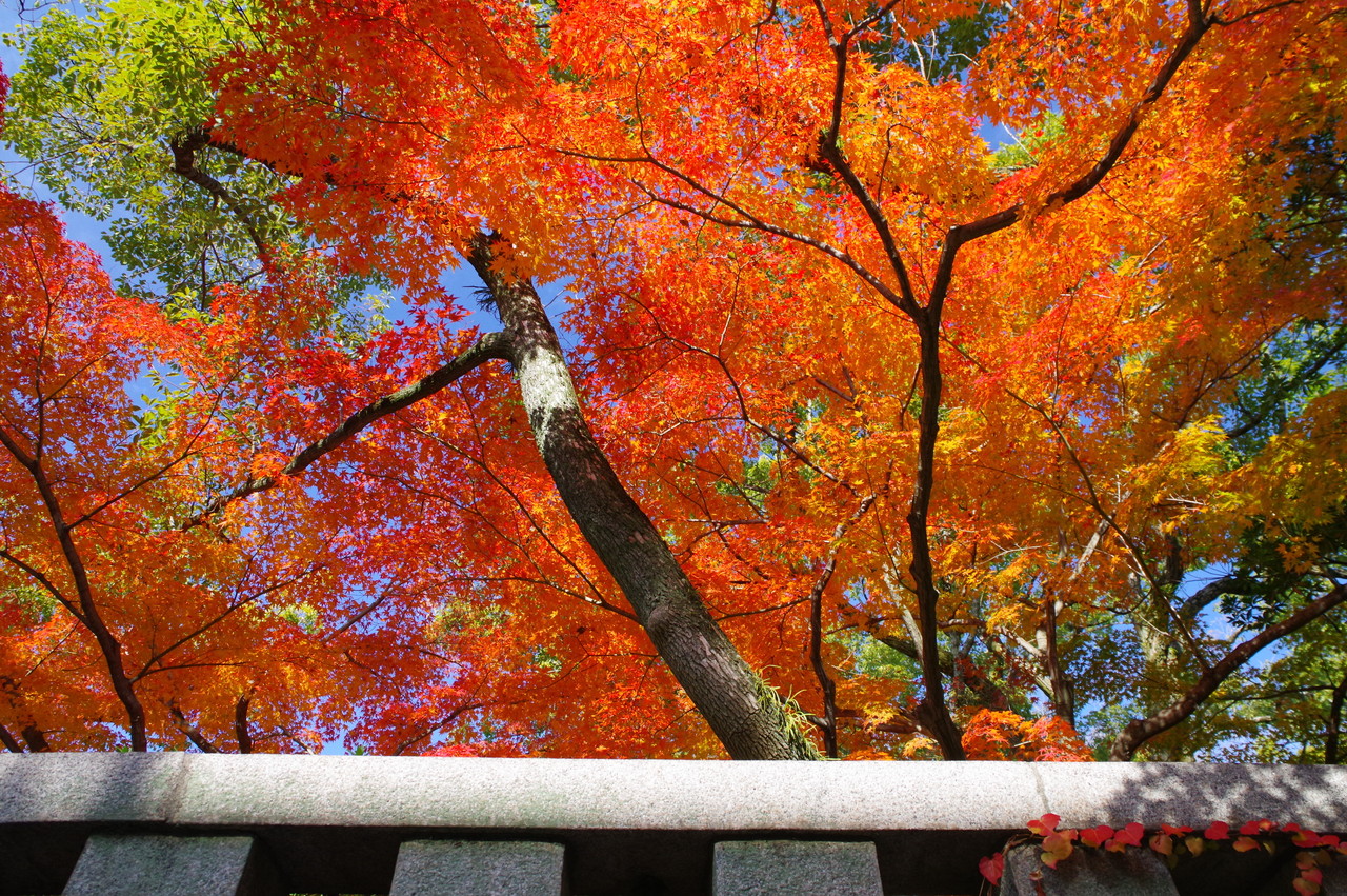 境内の東側の一角はもみじ真っ盛り。10時47分撮。