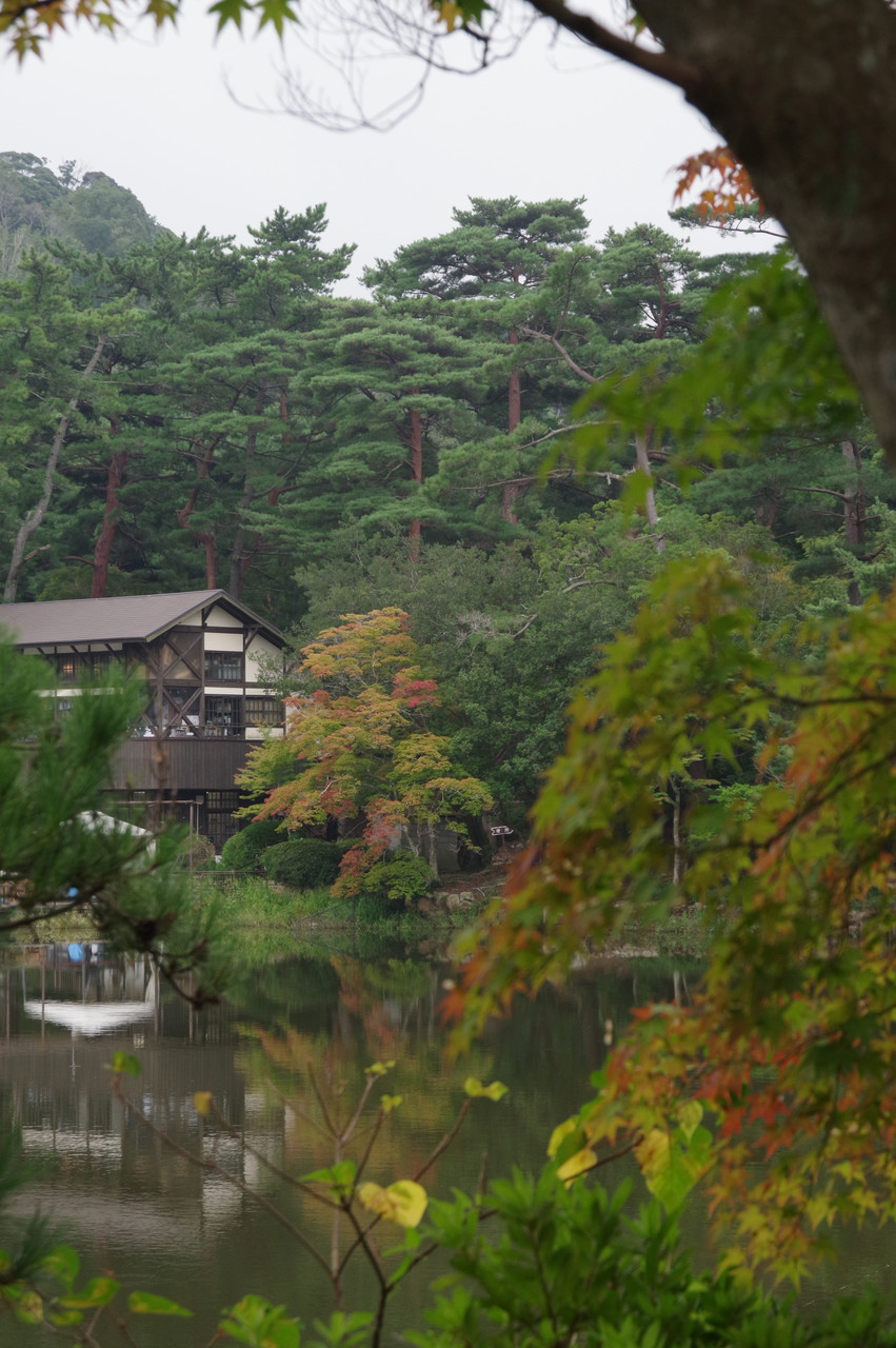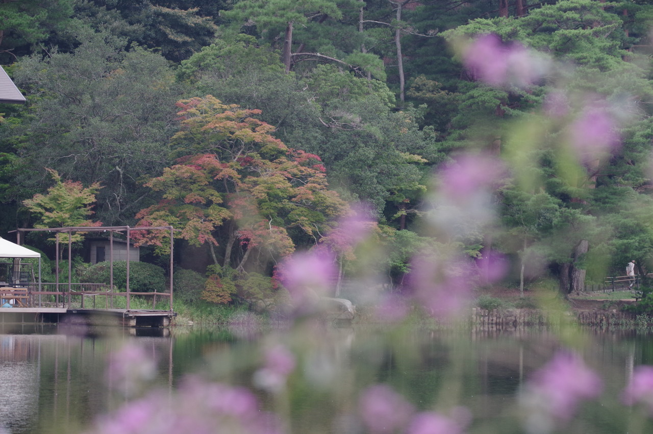 新池越しに秋の紅葉が映えるラクウショウは未だ緑濃き。