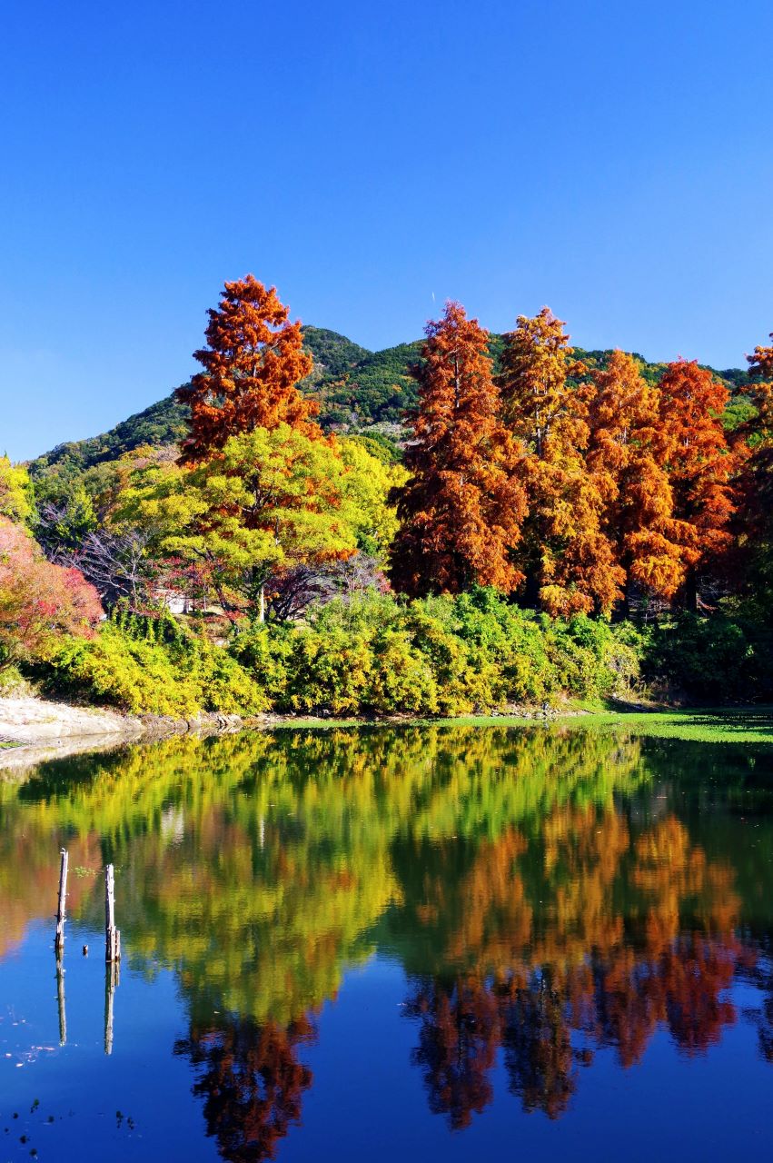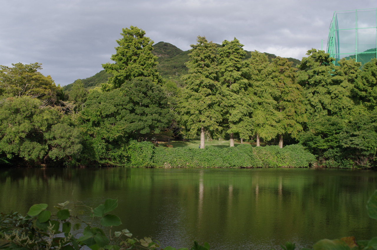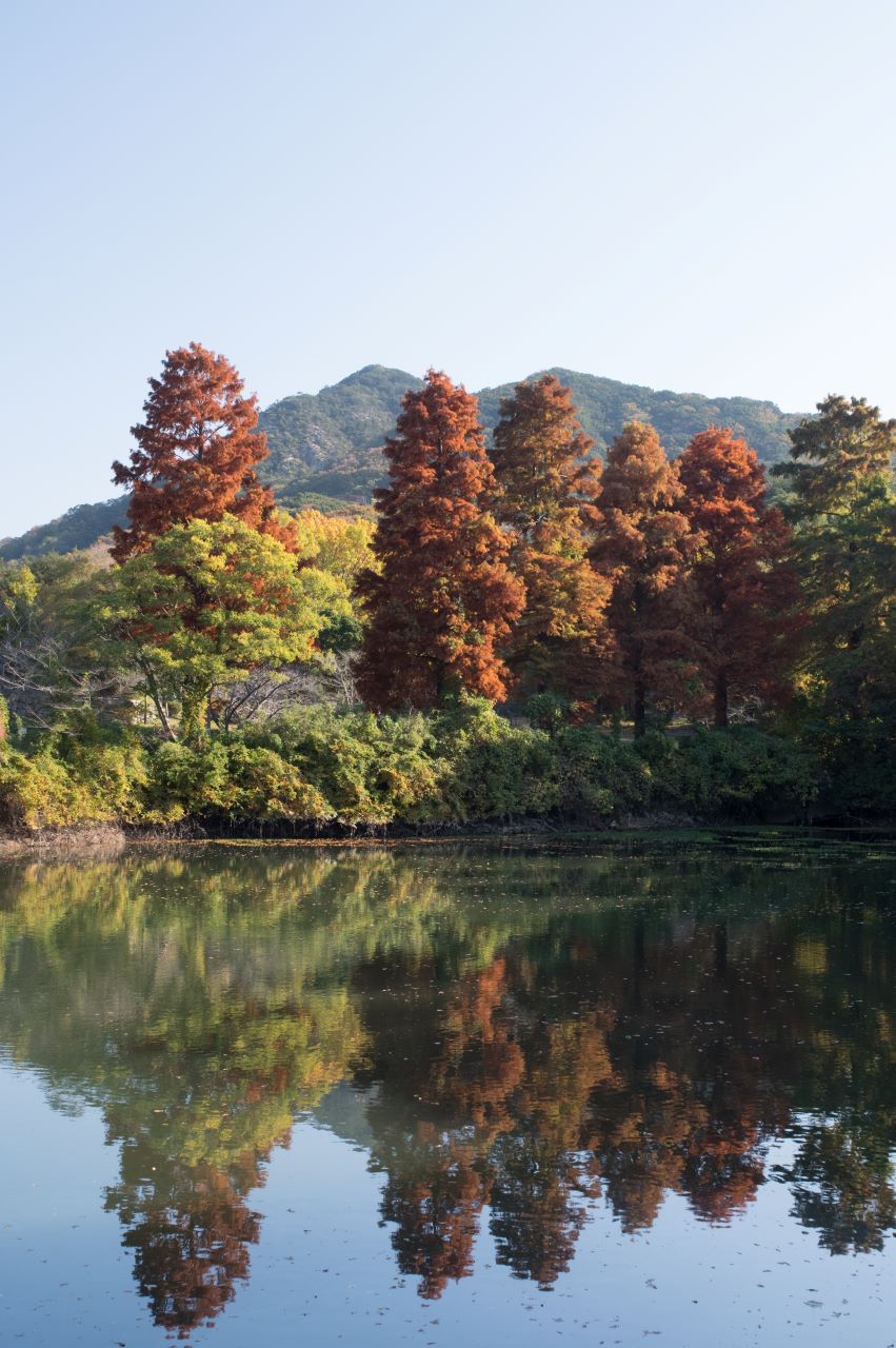 秋の紅葉が写真映えする新池越しのラクウショウも深緑。