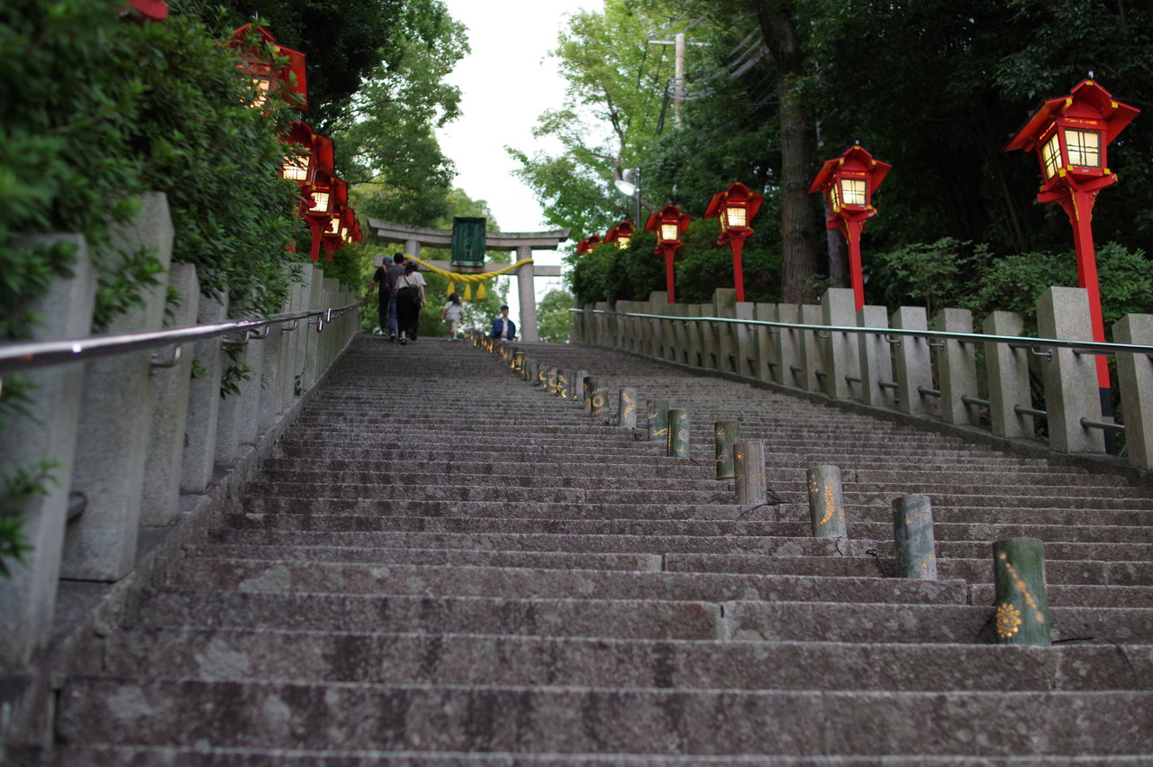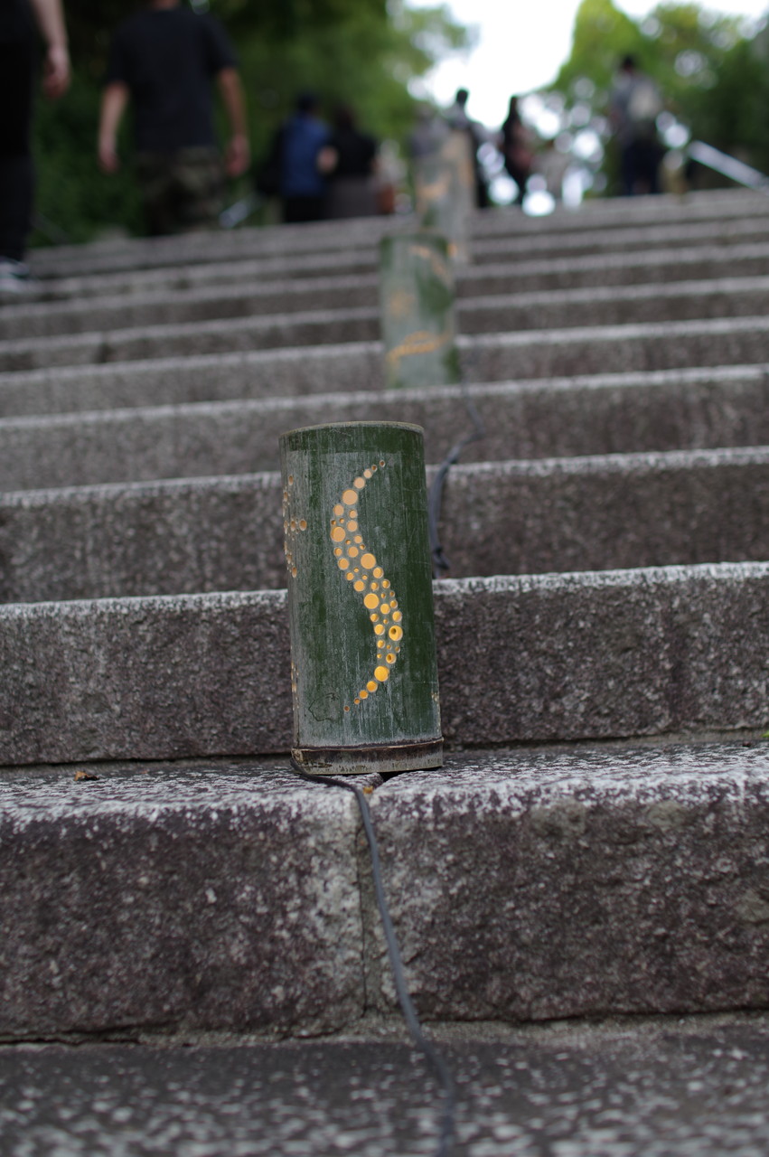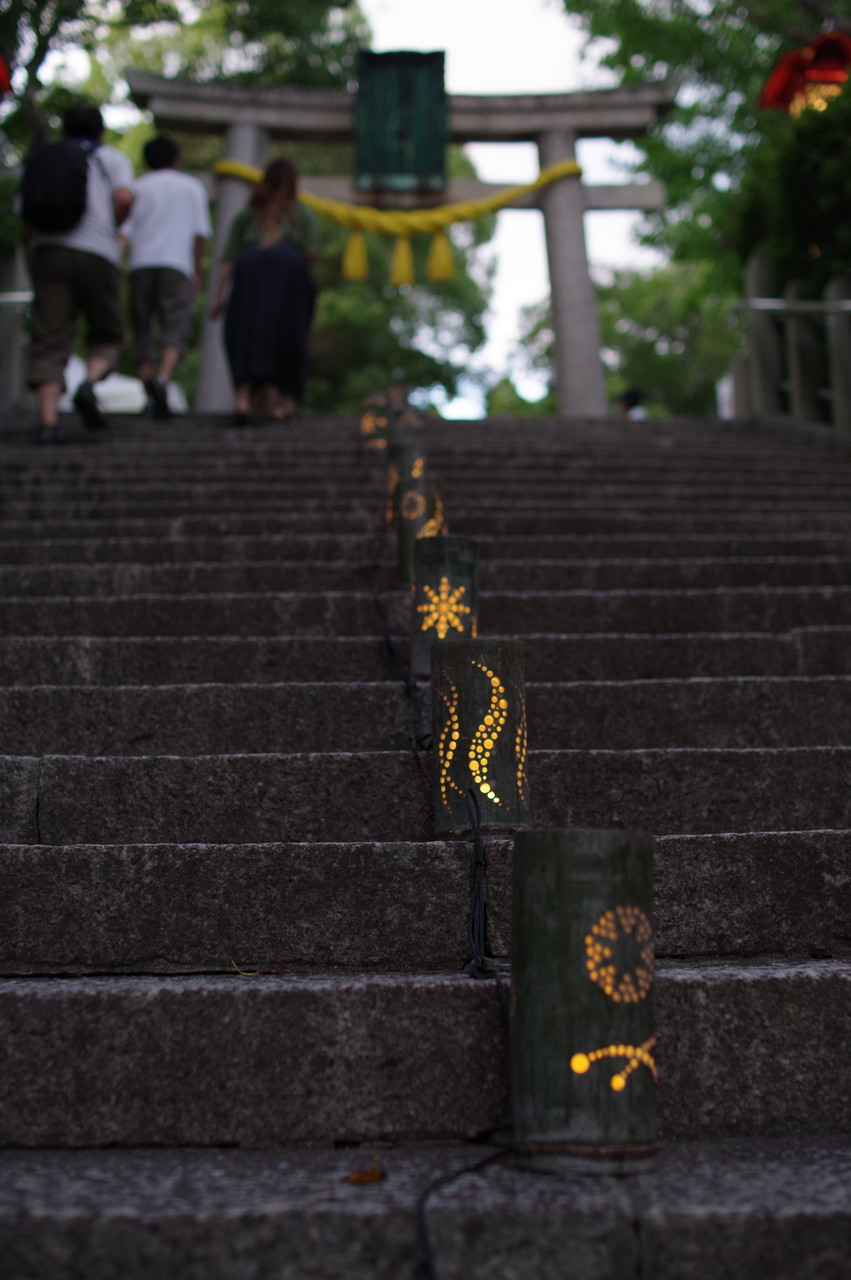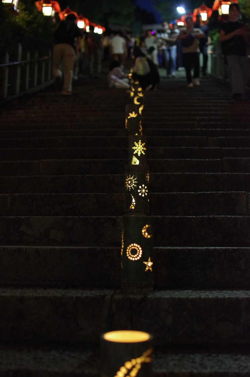 そこそこ暗くならないとひかりのアートは映えませんが、明るいうちからスナップ開始。二回も石段を往復しながらひかりアートをスナップ。暗くなるにつれ、見学者も多くなります。