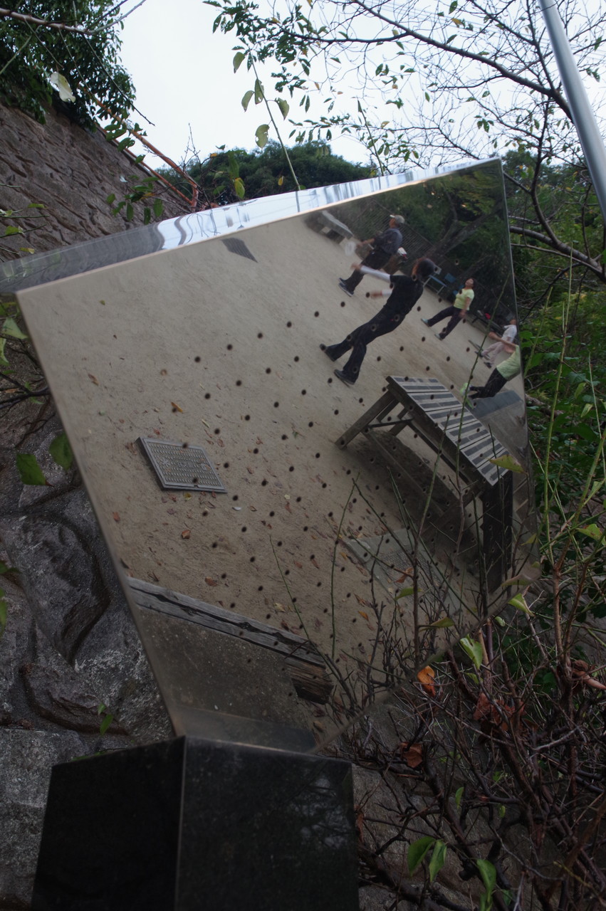 展望台の広場奥に立方体のオブジェがあります。ラジオ体操をされている人の映り込み。