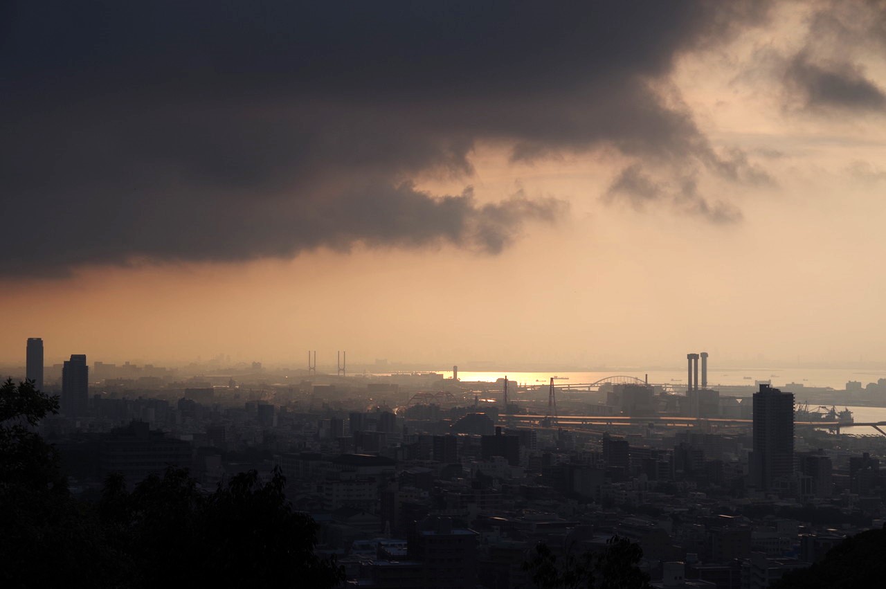 布引展望台から東側市街地を。何やら怪しげな雲行。