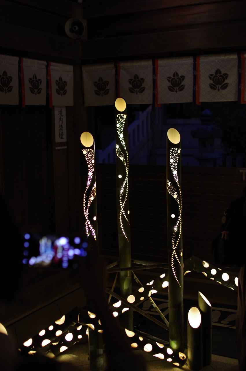 石段下と本殿を二回往復しながら撮りました。明るい時から、暗くなってからの幻想的なひかりのアートをスナップしました。講釈抜きです。駄作のオンパレードですが、ご高覧下さい。17時11分撮。