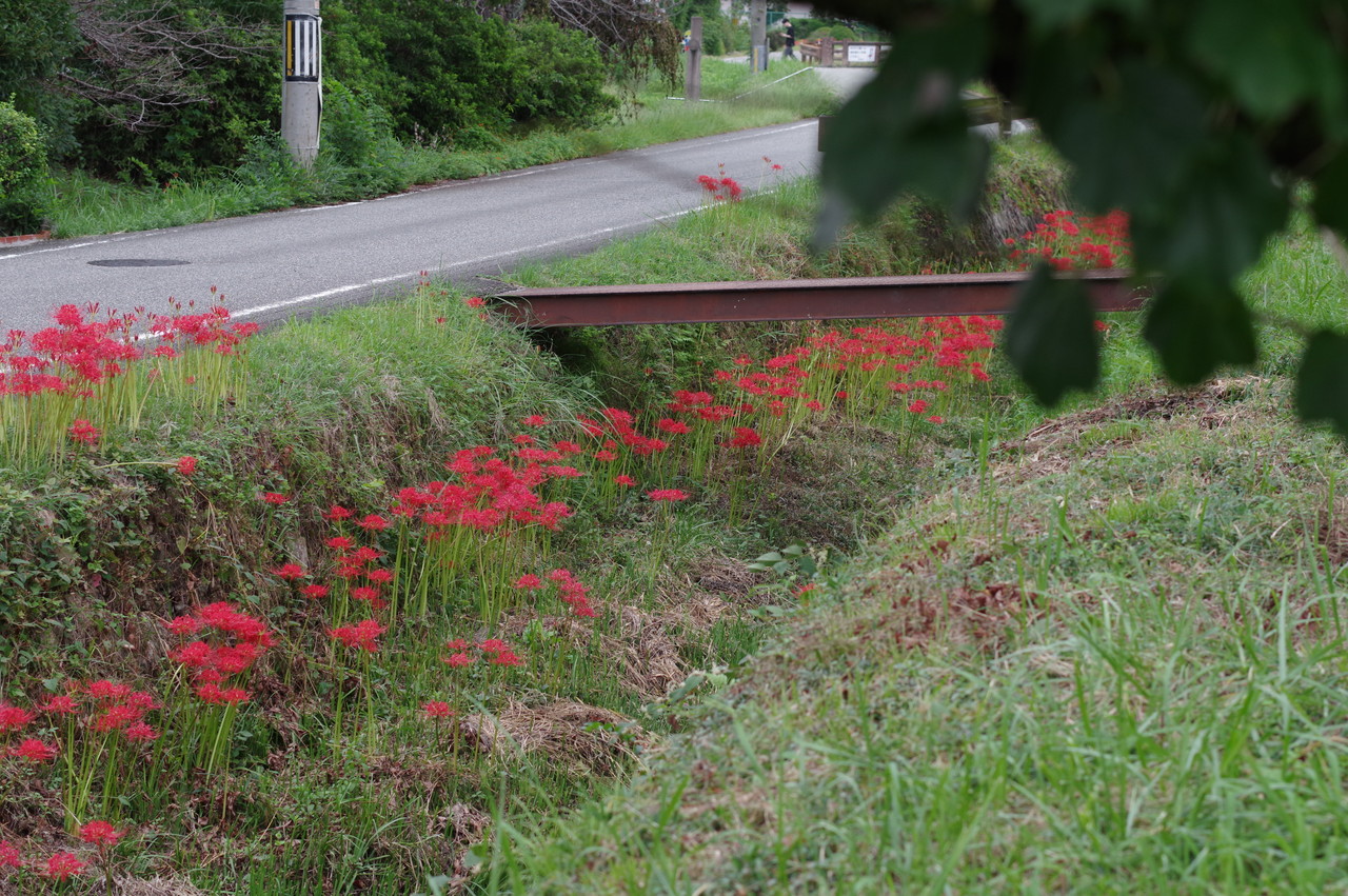 スナップしながら、そろそろ駅へ向かいましょう。土手の彼岸花。9時36分撮。
