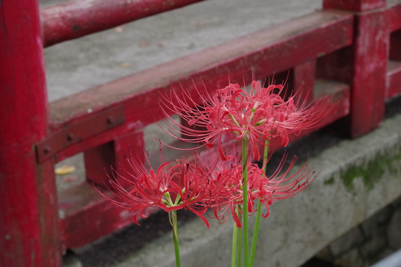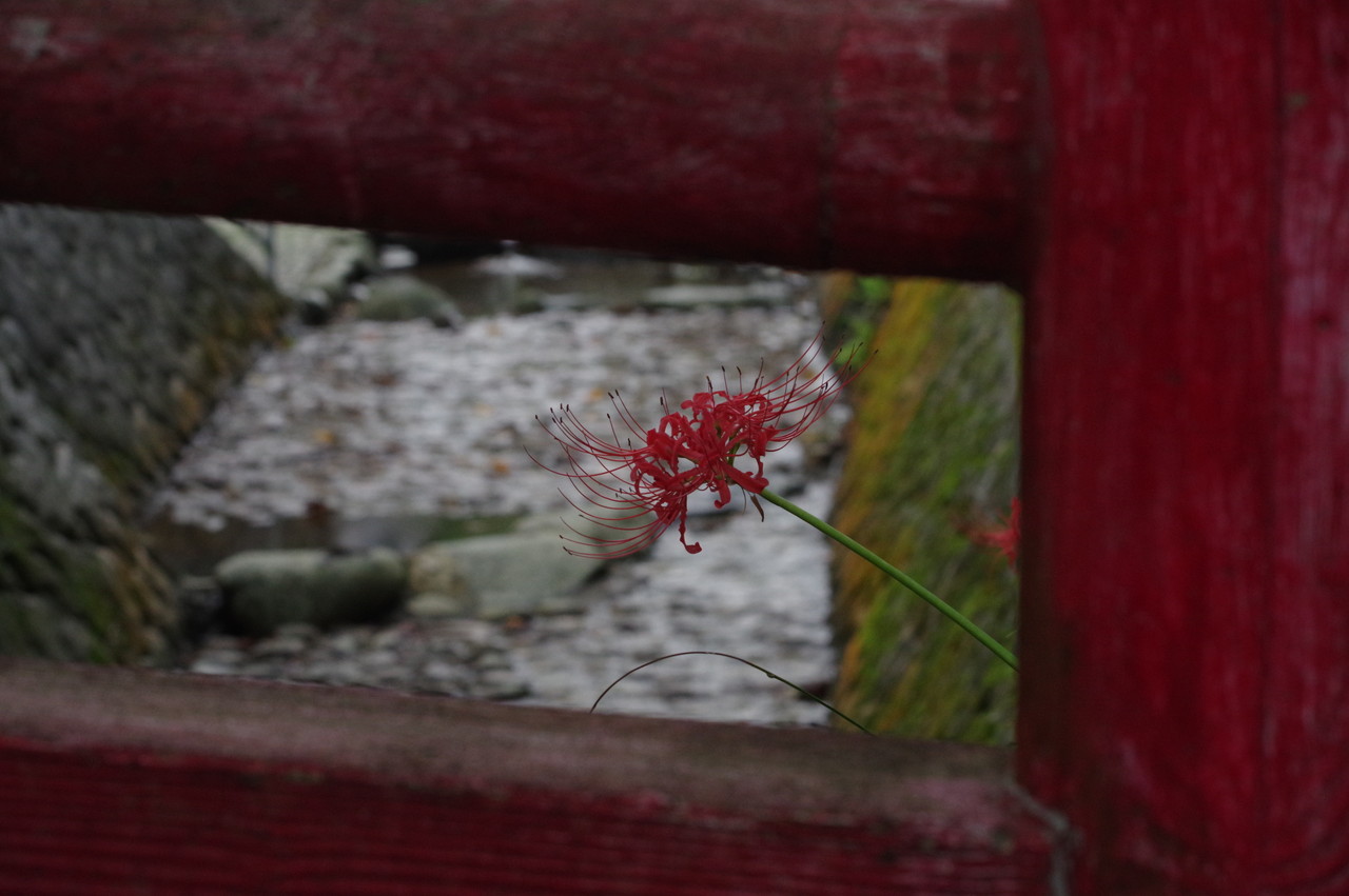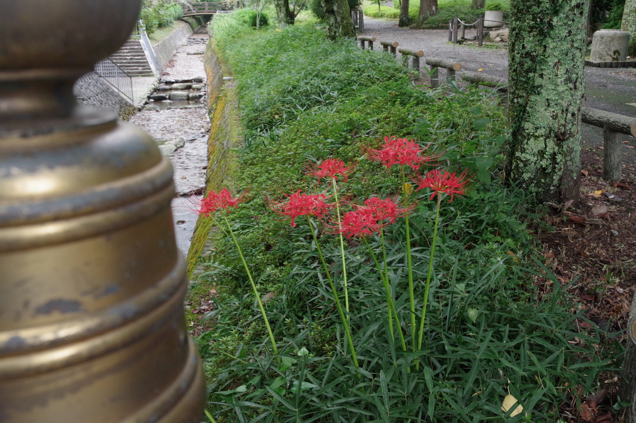 赤い橋のたもとに彼岸花。金色のギボシとコラボ。8時52分撮。