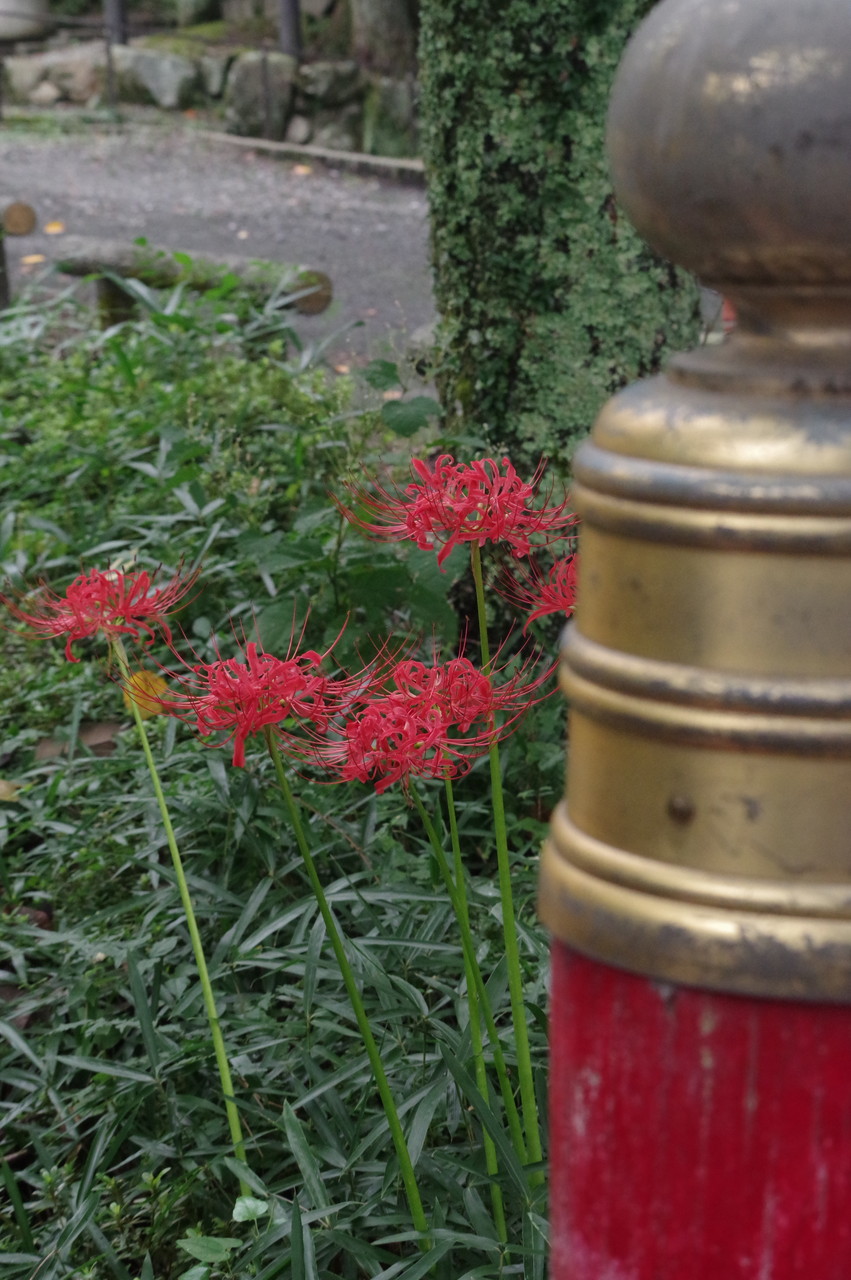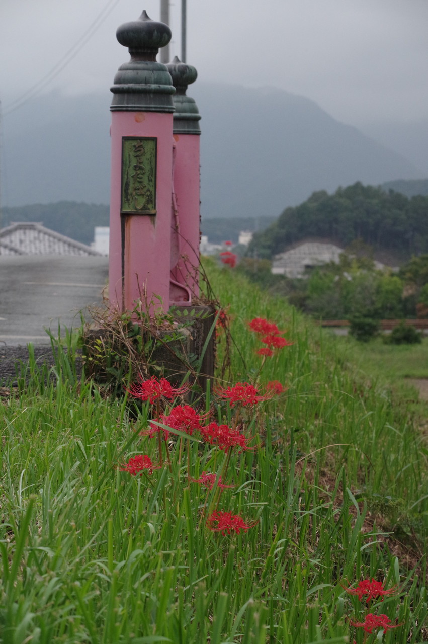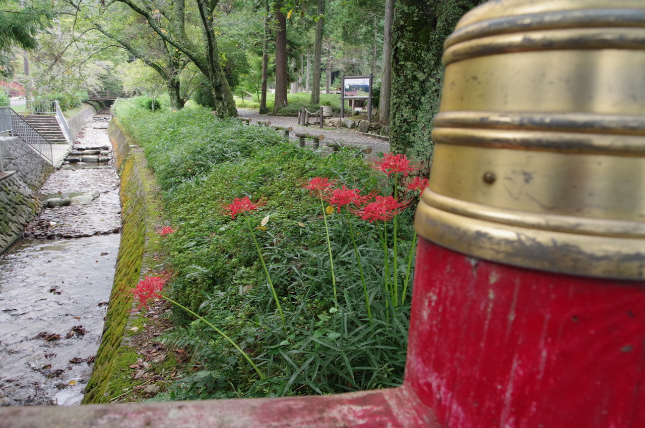 赤い橋のたもとに彼岸花。金色のギボシとコラボ。8時52分撮。