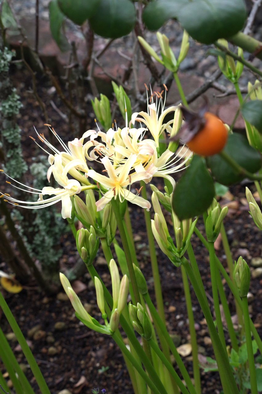 白い彼岸花(リコリス)と前ボケに柿の実。8時44分撮。
