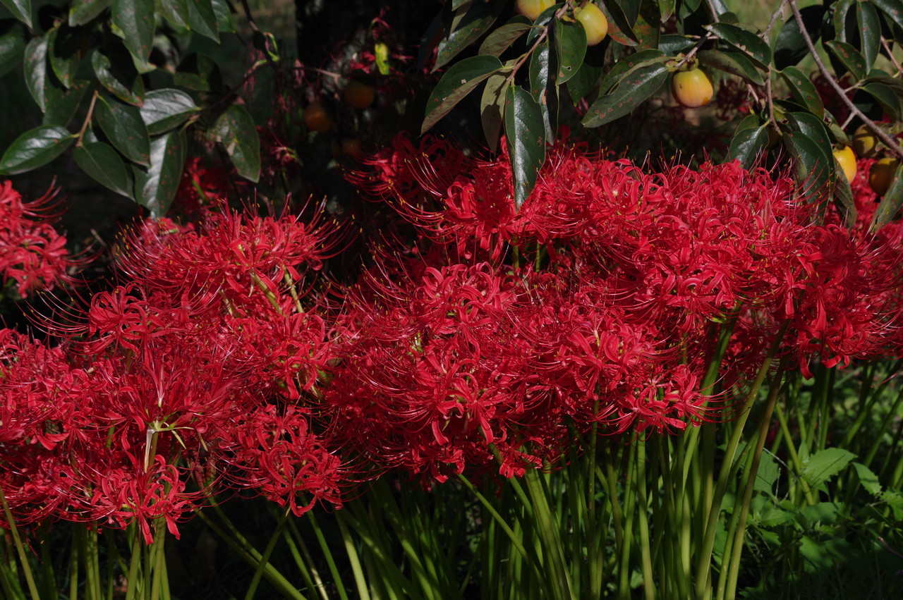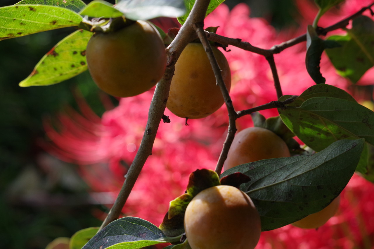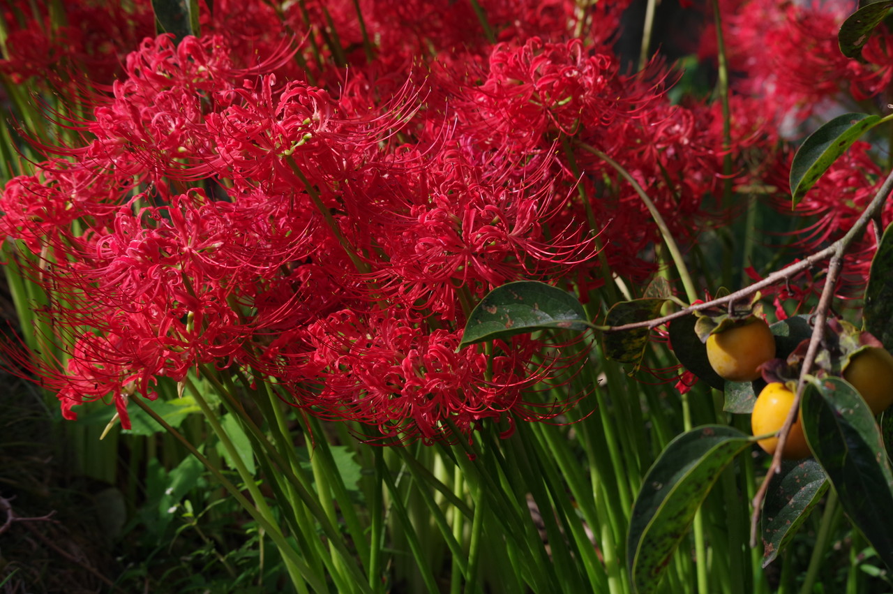 停留所の広場横の満開の彼岸花と、柿(今年は当たり度しか?、一本の樹にいっぱいの実を付けています。)のコラボ。8時28分撮。