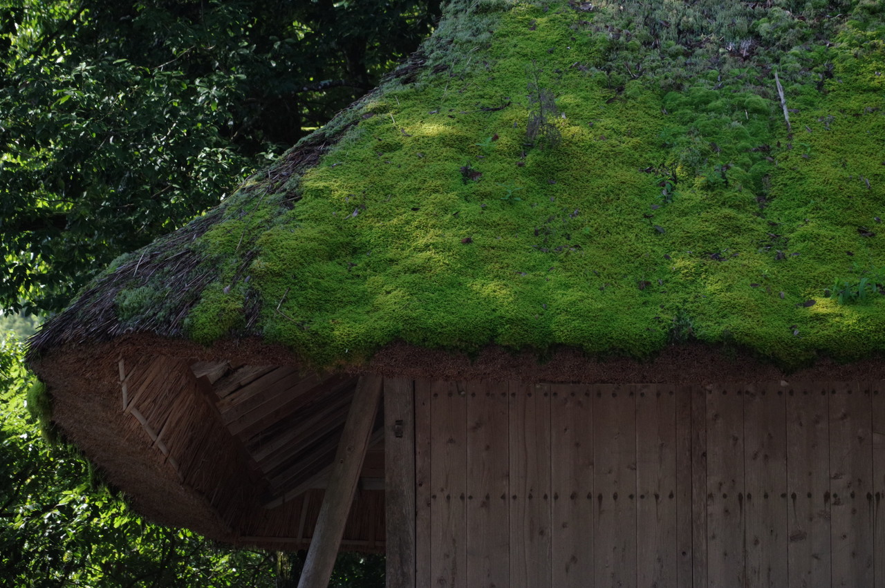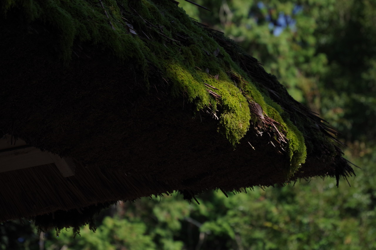 神社で大休息。苔生した神社の倉庫の茅葺き屋根。9時24分撮。